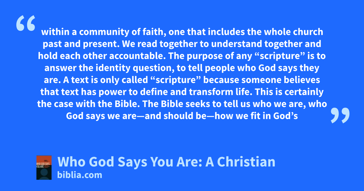 within a community of faith, one that includes the whole church past and present. We read together to understand together and hold each other accountable. The purpose of any “scripture” is to answer the identity question, to tell people who God says they are. A text is only called “scripture” because someone believes that text has power to define and transform life. This is certainly the case with the Bible. The Bible seeks to tell us who we are, who God says we are—and should be—how we fit in God’s