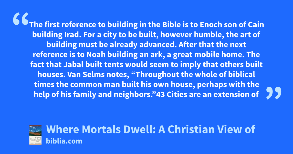 The first reference to building in the Bible is to Enoch son of Cain building Irad. For a city to be built, however humble, the art of building must be already advanced. After that the next reference is to Noah building an ark, a great mobile home. The fact that Jabal built tents would seem to imply that others built houses. Van Selms notes, “Throughout the whole of biblical times the common man built his own house, perhaps with the help of his family and neighbors.”43 Cities are an extension of