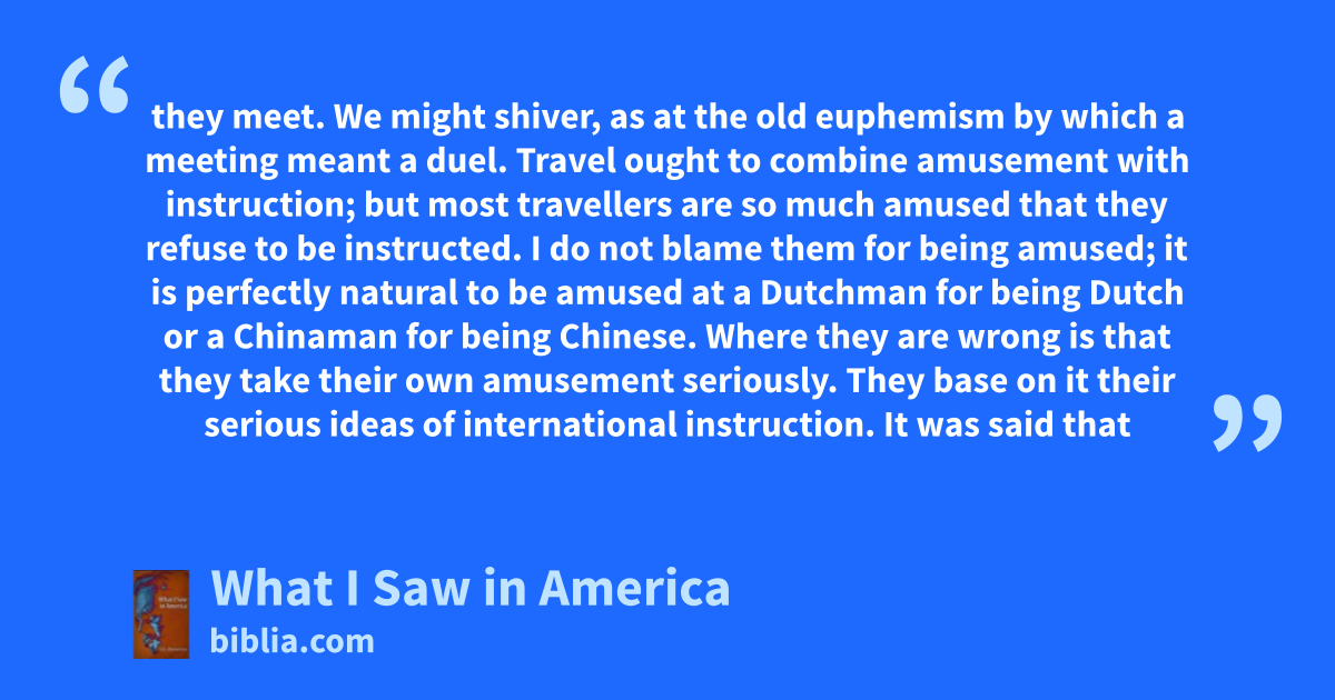 they meet. We might shiver, as at the old euphemism by which a meeting meant a duel. Travel ought to combine amusement with instruction; but most travellers are so much amused that they refuse to be instructed. I do not blame them for being amused; it is perfectly natural to be amused at a Dutchman for being Dutch or a Chinaman for being Chinese. Where they are wrong is that they take their own amusement seriously. They base on it their serious ideas of international instruction. It was said that