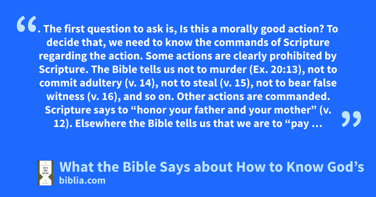 . The first question to ask is, Is this a morally good action? To decide that, we need to know the commands of Scripture regarding the action. Some actions are clearly prohibited by Scripture. The Bible tells us not to murder (Ex. 20:13), not to commit adultery (v. 14), not to steal (v. 15), not to bear false witness (v. 16), and so on. Other actions are commanded. Scripture says to “honor your father and your mother” (v. 12). Elsewhere the Bible tells us that we are to “pay …