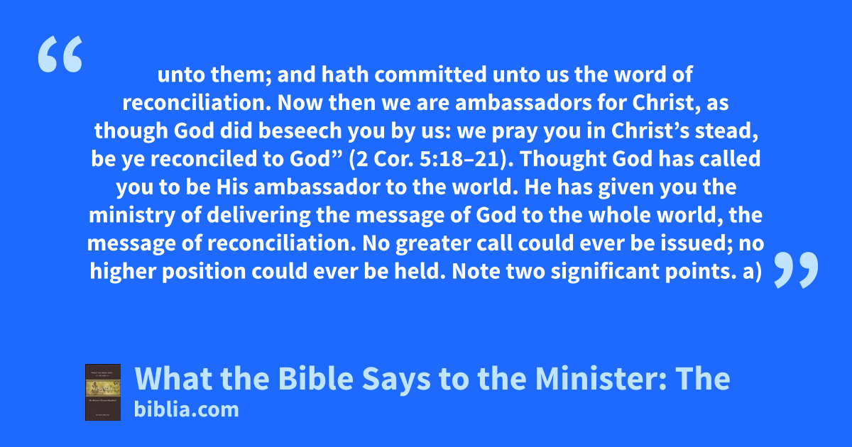 unto them; and hath committed unto us the word of reconciliation. Now then we are ambassadors for Christ, as though God did beseech you by us: we pray you in Christ’s stead, be ye reconciled to God” (2 Cor. 5:18–21). Thought God has called you to be His ambassador to the world. He has given you the ministry of delivering the message of God to the whole world, the message of reconciliation. No greater call could ever be issued; no higher position could ever be held. Note two significant points. a)