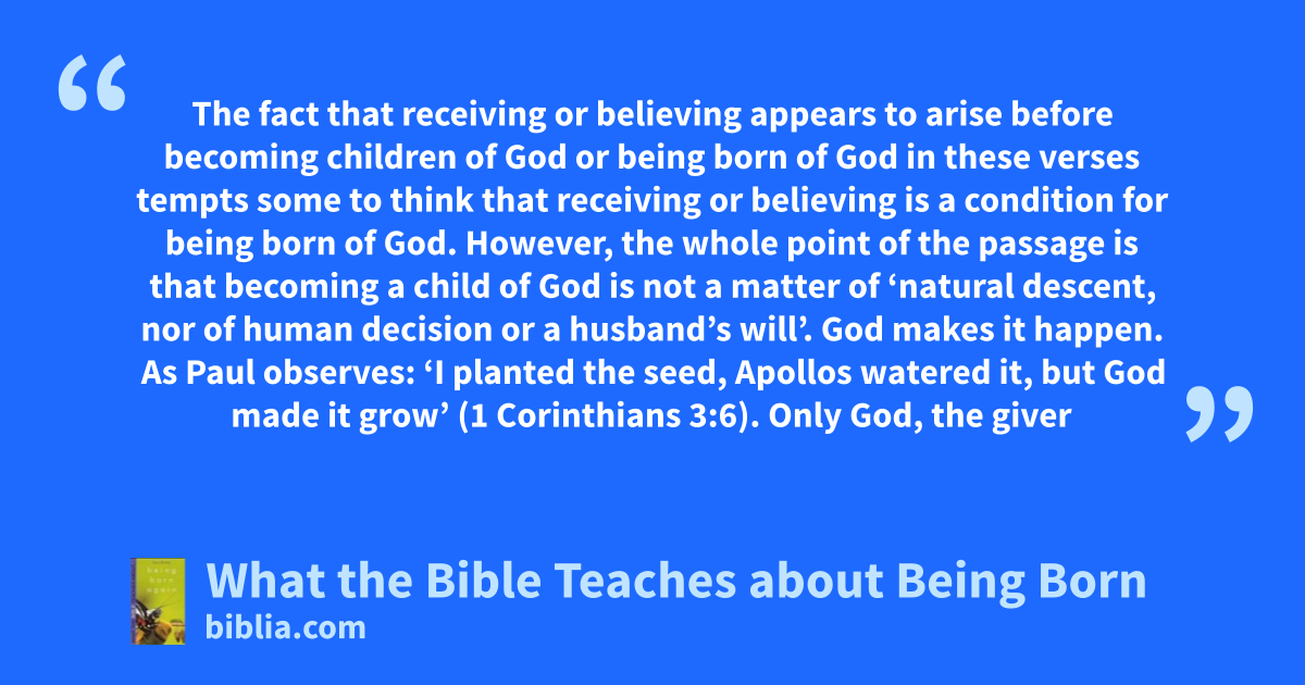 The fact that receiving or believing appears to arise before becoming children of God or being born of God in these verses tempts some to think that receiving or believing is a condition for being born of God. However, the whole point of the passage is that becoming a child of God is not a matter of ‘natural descent, nor of human decision or a husband’s will’. God makes it happen. As Paul observes: ‘I planted the seed, Apollos watered it, but God made it grow’ (1 Corinthians 3:6). Only God, the giver
