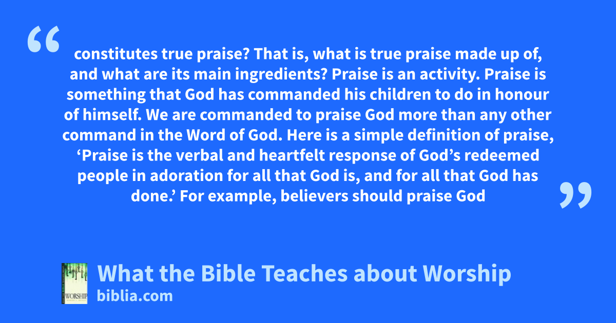 constitutes true praise? That is, what is true praise made up of, and what are its main ingredients? Praise is an activity. Praise is something that God has commanded his children to do in honour of himself. We are commanded to praise God more than any other command in the Word of God. Here is a simple definition of praise, ‘Praise is the verbal and heartfelt response of God’s redeemed people in adoration for all that God is, and for all that God has done.’ For example, believers should praise God