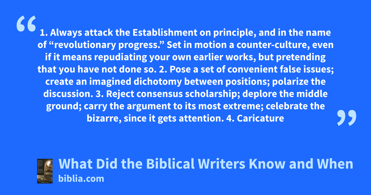 1. Always attack the Establishment on principle, and in the name of “revolutionary progress.” Set in motion a counter-culture, even if it means repudiating your own earlier works, but pretending that you have not done so. 2. Pose a set of convenient false issues; create an imagined dichotomy between positions; polarize the discussion. 3. Reject consensus scholarship; deplore the middle ground; carry the argument to its most extreme; celebrate the bizarre, since it gets attention. 4. Caricature