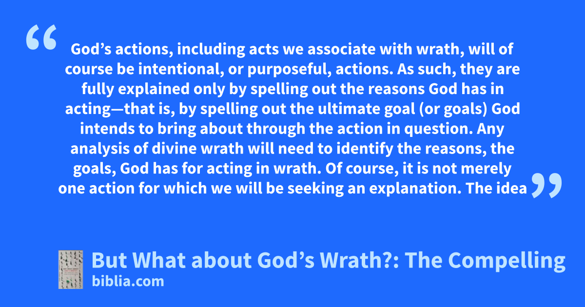 God’s actions, including acts we associate with wrath, will of course be intentional, or purposeful, actions. As such, they are fully explained only by spelling out the reasons God has in acting—that is, by spelling out the ultimate goal (or goals) God intends to bring about through the action in question. Any analysis of divine wrath will need to identify the reasons, the goals, God has for acting in wrath. Of course, it is not merely one action for which we will be seeking an explanation. The idea