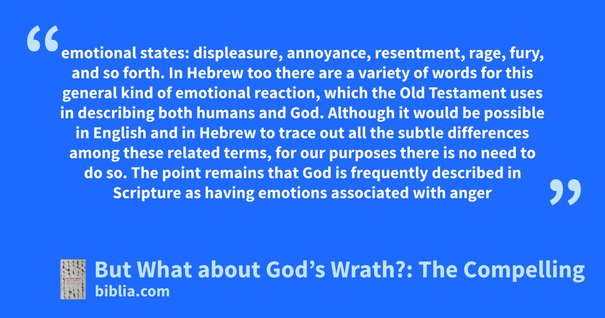 emotional states: displeasure, annoyance, resentment, rage, fury, and so forth. In Hebrew too there are a variety of words for this general kind of emotional reaction, which the Old Testament uses in describing both humans and God. Although it would be possible in English and in Hebrew to trace out all the subtle differences among these related terms, for our purposes there is no need to do so. The point remains that God is frequently described in Scripture as having emotions associated with anger