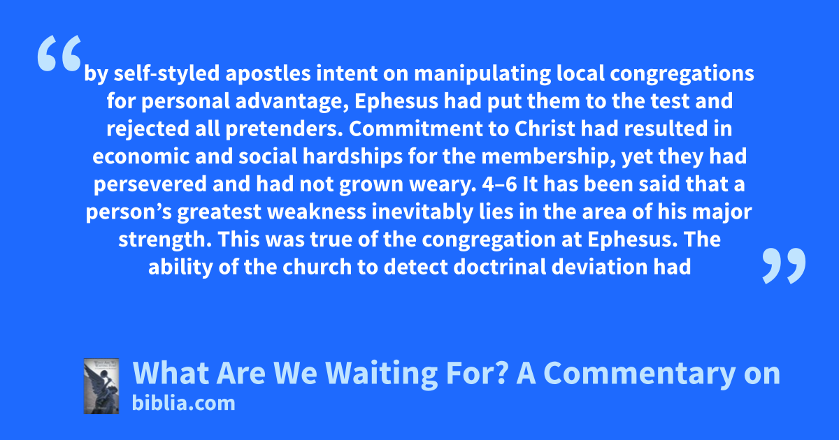 by self-styled apostles intent on manipulating local congregations for personal advantage, Ephesus had put them to the test and rejected all pretenders. Commitment to Christ had resulted in economic and social hardships for the membership, yet they had persevered and had not grown weary. 4–6 It has been said that a person’s greatest weakness inevitably lies in the area of his major strength. This was true of the congregation at Ephesus. The ability of the church to detect doctrinal deviation had