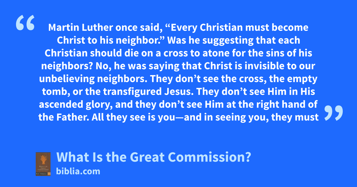 Martin Luther once said, “Every Christian must become Christ to his neighbor.” Was he suggesting that each Christian should die on a cross to atone for the sins of his neighbors? No, he was saying that Christ is invisible to our unbelieving neighbors. They don’t see the cross, the empty tomb, or the transfigured Jesus. They don’t see Him in His ascended glory, and they don’t see Him at the right hand of the Father. All they see is you—and in seeing you, they must