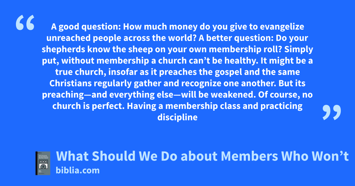 A good question: How much money do you give to evangelize unreached people across the world? A better question: Do your shepherds know the sheep on your own membership roll? Simply put, without membership a church can’t be healthy. It might be a true church, insofar as it preaches the gospel and the same Christians regularly gather and recognize one another. But its preaching—and everything else—will be weakened. Of course, no church is perfect. Having a membership class and practicing discipline