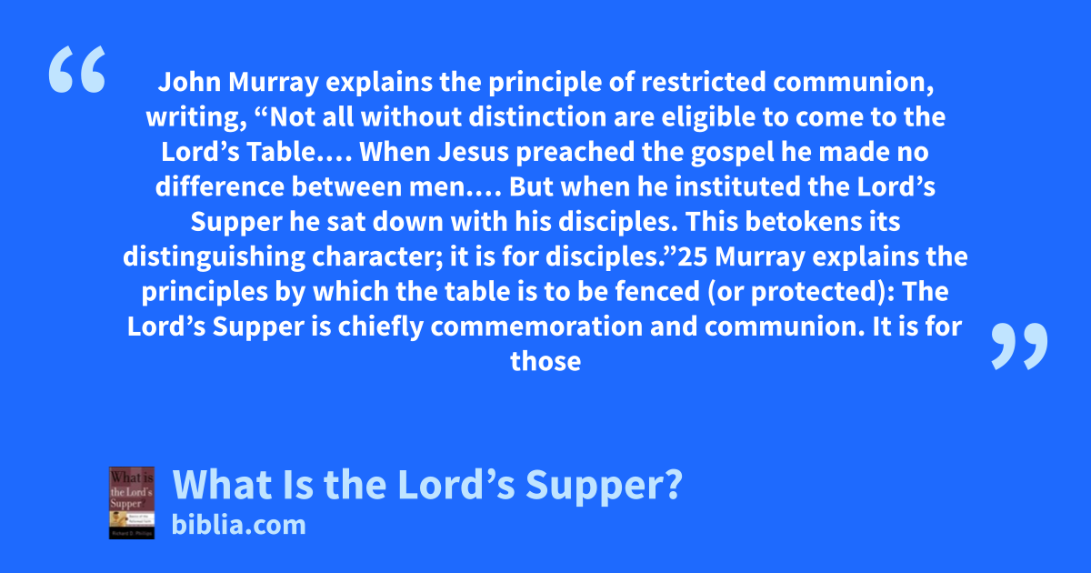 John Murray explains the principle of restricted communion, writing, “Not all without distinction are eligible to come to the Lord’s Table.… When Jesus preached the gospel he made no difference between men.… But when he instituted the Lord’s Supper he sat down with his disciples. This betokens its distinguishing character; it is for disciples.”25 Murray explains the principles by which the table is to be fenced (or protected): The Lord’s Supper is chiefly commemoration and communion. It is for those