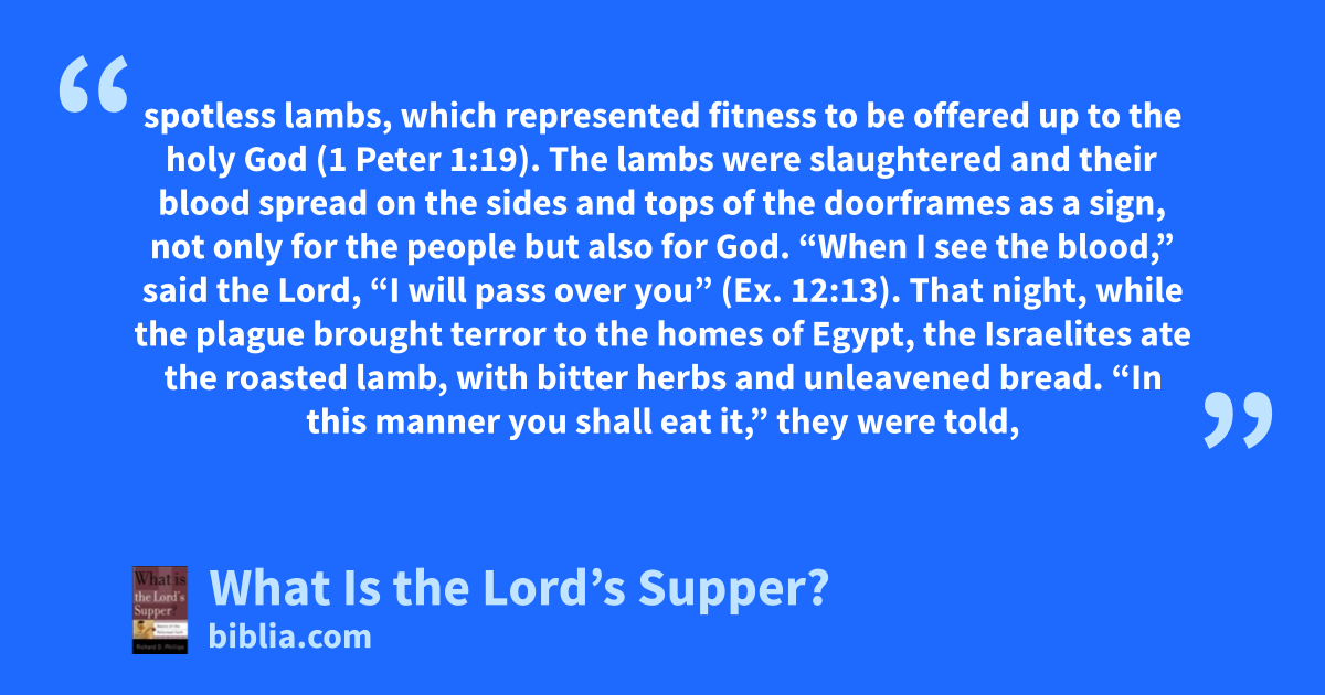spotless lambs, which represented fitness to be offered up to the holy God (1 Peter 1:19). The lambs were slaughtered and their blood spread on the sides and tops of the doorframes as a sign, not only for the people but also for God. “When I see the blood,” said the Lord, “I will pass over you” (Ex. 12:13). That night, while the plague brought terror to the homes of Egypt, the Israelites ate the roasted lamb, with bitter herbs and unleavened bread. “In this manner you shall eat it,” they were told,