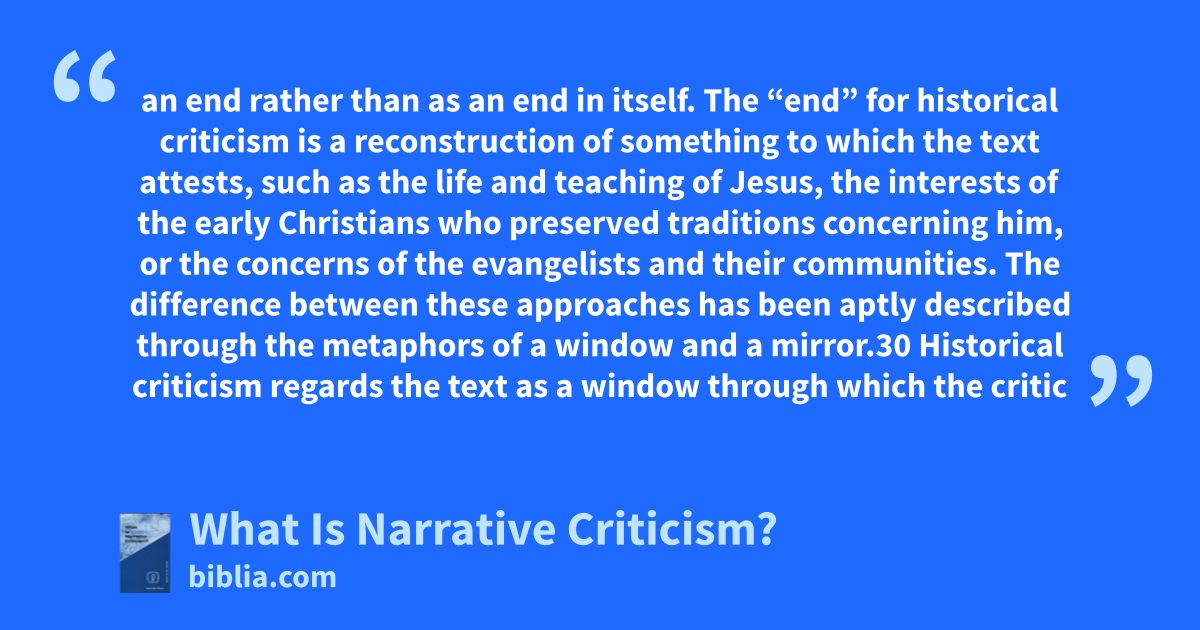 an end rather than as an end in itself. The “end” for historical criticism is a reconstruction of something to which the text attests, such as the life and teaching of Jesus, the interests of the early Christians who preserved traditions concerning him, or the concerns of the evangelists and their communities. The difference between these approaches has been aptly described through the metaphors of a window and a mirror.30 Historical criticism regards the text as a window through which the critic