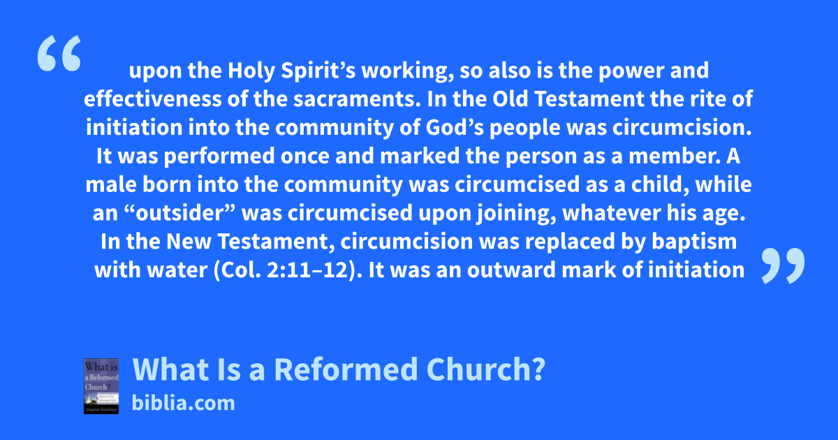 upon the Holy Spirit’s working, so also is the power and effectiveness of the sacraments. In the Old Testament the rite of initiation into the community of God’s people was circumcision. It was performed once and marked the person as a member. A male born into the community was circumcised as a child, while an “outsider” was circumcised upon joining, whatever his age. In the New Testament, circumcision was replaced by baptism with water (Col. 2:11–12). It was an outward mark of initiation