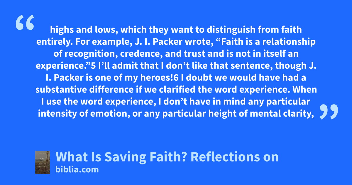 highs and lows, which they want to distinguish from faith entirely. For example, J. I. Packer wrote, “Faith is a relationship of recognition, credence, and trust and is not in itself an experience.”5 I’ll admit that I don’t like that sentence, though J. I. Packer is one of my heroes!6 I doubt we would have had a substantive difference if we clarified the word experience. When I use the word experience, I don’t have in mind any particular intensity of emotion, or any particular height of mental clarity,