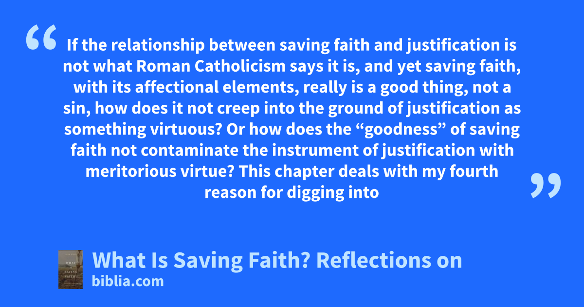 If the relationship between saving faith and justification is not what Roman Catholicism says it is, and yet saving faith, with its affectional elements, really is a good thing, not a sin, how does it not creep into the ground of justification as something virtuous? Or how does the “goodness” of saving faith not contaminate the instrument of justification with meritorious virtue? This chapter deals with my fourth reason for digging into