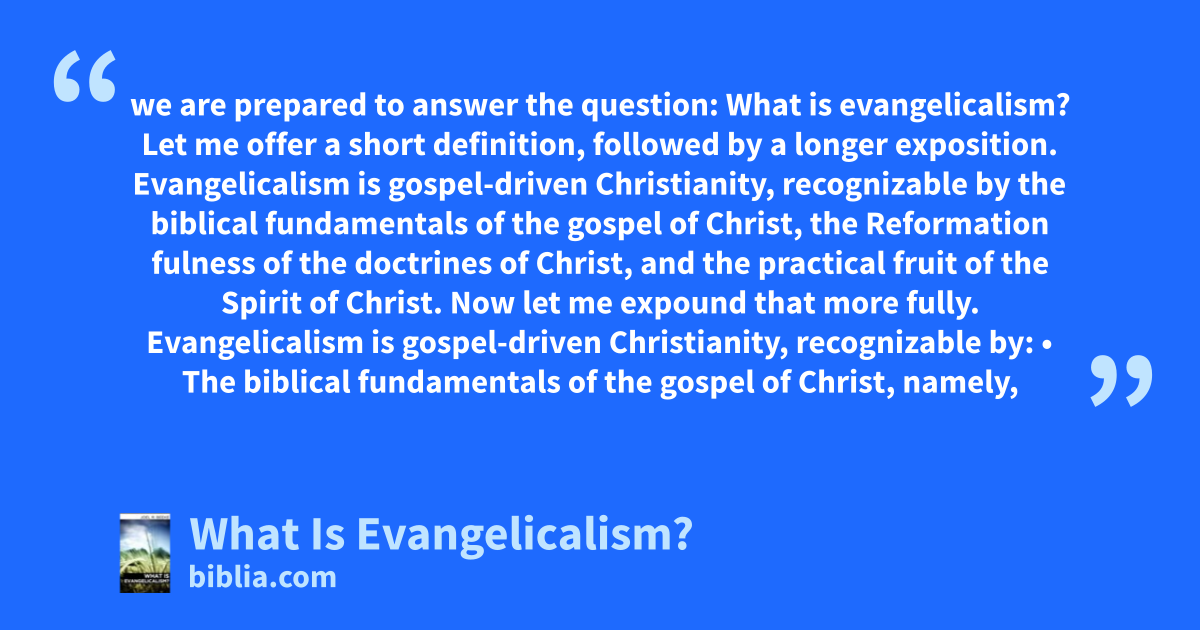 we are prepared to answer the question: What is evangelicalism? Let me offer a short definition, followed by a longer exposition. Evangelicalism is gospel-driven Christianity, recognizable by the biblical fundamentals of the gospel of Christ, the Reformation fulness of the doctrines of Christ, and the practical fruit of the Spirit of Christ. Now let me expound that more fully. Evangelicalism is gospel-driven Christianity, recognizable by: • The biblical fundamentals of the gospel of Christ, namely,