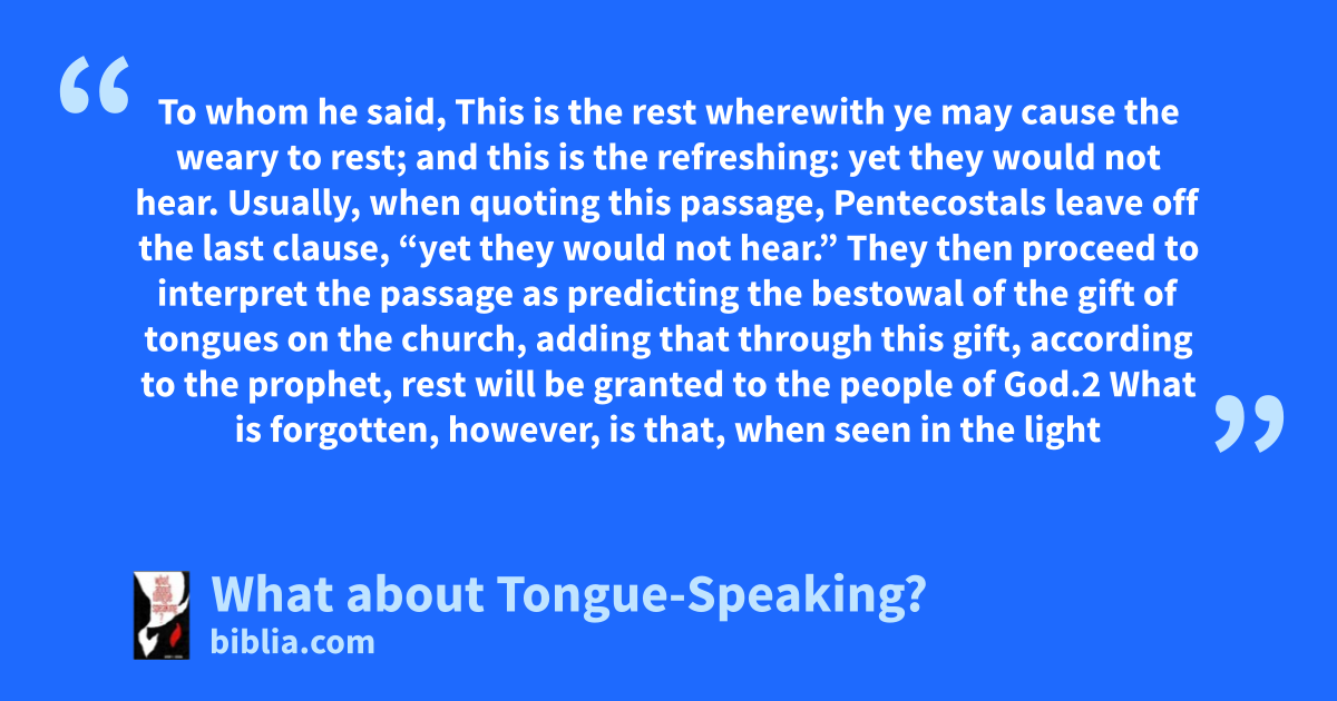 To whom he said, This is the rest wherewith ye may cause the weary to rest; and this is the refreshing: yet they would not hear. Usually, when quoting this passage, Pentecostals leave off the last clause, “yet they would not hear.” They then proceed to interpret the passage as predicting the bestowal of the gift of tongues on the church, adding that through this gift, according to the prophet, rest will be granted to the people of God.2 What is forgotten, however, is that, when seen in the light