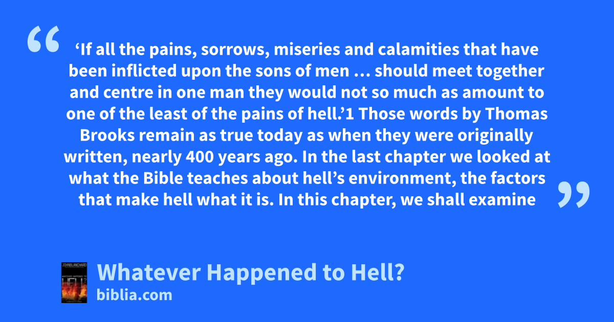 ‘If all the pains, sorrows, miseries and calamities that have been inflicted upon the sons of men … should meet together and centre in one man they would not so much as amount to one of the least of the pains of hell.’1 Those words by Thomas Brooks remain as true today as when they were originally written, nearly 400 years ago. In the last chapter we looked at what the Bible teaches about hell’s environment, the factors that make hell what it is. In this chapter, we shall examine