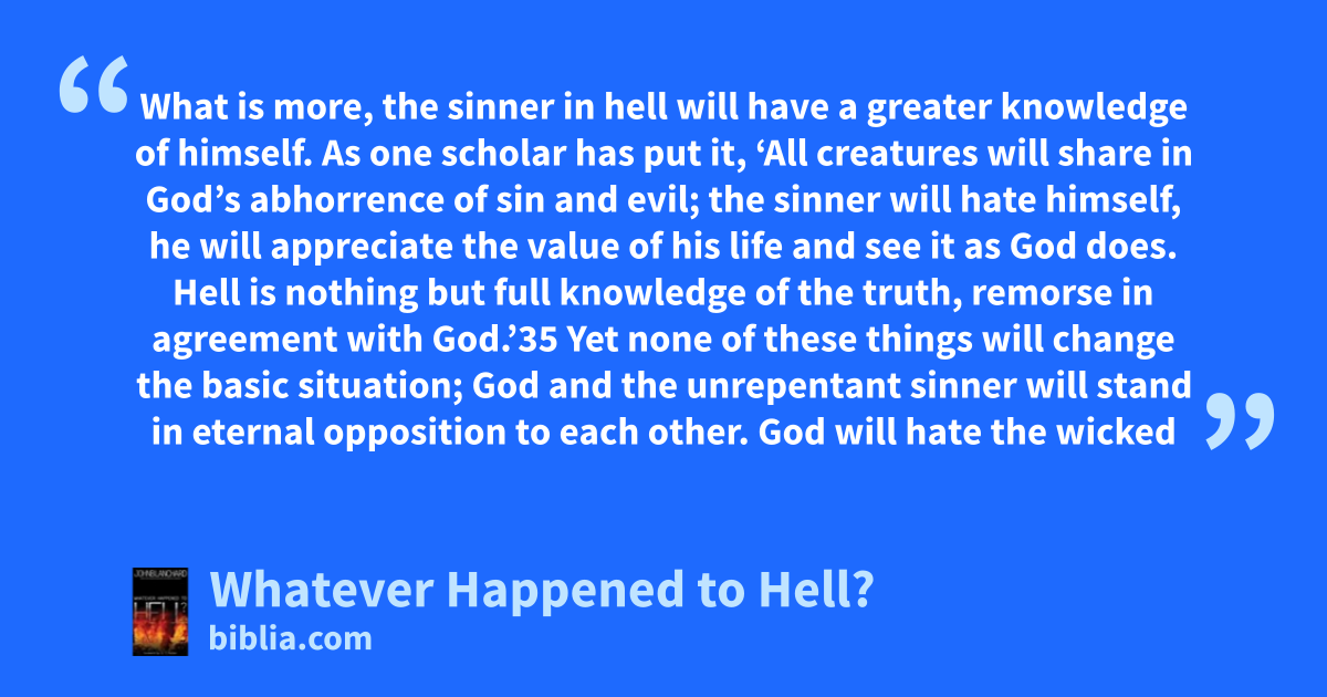 What is more, the sinner in hell will have a greater knowledge of himself. As one scholar has put it, ‘All creatures will share in God’s abhorrence of sin and evil; the sinner will hate himself, he will appreciate the value of his life and see it as God does. Hell is nothing but full knowledge of the truth, remorse in agreement with God.’35 Yet none of these things will change the basic situation; God and the unrepentant sinner will stand in eternal opposition to each other. God will hate the wicked