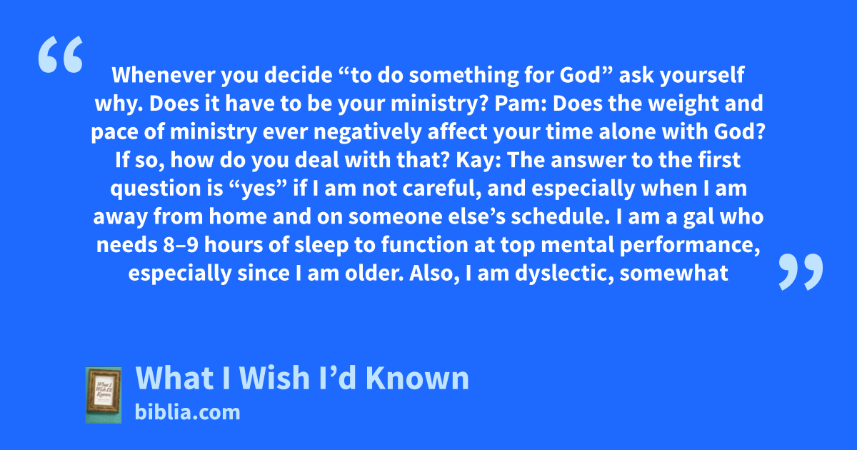 Whenever you decide “to do something for God” ask yourself why. Does it have to be your ministry? Pam: Does the weight and pace of ministry ever negatively affect your time alone with God? If so, how do you deal with that? Kay: The answer to the first question is “yes” if I am not careful, and especially when I am away from home and on someone else’s schedule. I am a gal who needs 8–9 hours of sleep to function at top mental performance, especially since I am older. Also, I am dyslectic, somewhat
