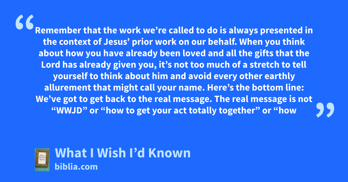Remember that the work we’re called to do is always presented in the context of Jesus’ prior work on our behalf. When you think about how you have already been loved and all the gifts that the Lord has already given you, it’s not too much of a stretch to tell yourself to think about him and avoid every other earthly allurement that might call your name. Here’s the bottom line: We’ve got to get back to the real message. The real message is not “WWJD” or “how to get your act totally together” or “how