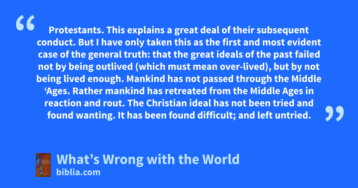 Protestants. This explains a great deal of their subsequent conduct. But I have only taken this as the first and most evident case of the general truth: that the great ideals of the past failed not by being outlived (which must mean over-lived), but by not being lived enough. Mankind has not passed through the Middle ‘Ages. Rather mankind has retreated from the Middle Ages in reaction and rout. The Christian ideal has not been tried and found wanting. It has been found difficult; and left untried.