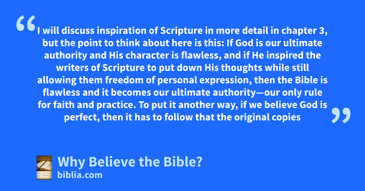 I will discuss inspiration of Scripture in more detail in chapter 3, but the point to think about here is this: If God is our ultimate authority and His character is flawless, and if He inspired the writers of Scripture to put down His thoughts while still allowing them freedom of personal expression, then the Bible is flawless and it becomes our ultimate authority—our only rule for faith and practice. To put it another way, if we believe God is perfect, then it has to follow that the original copies