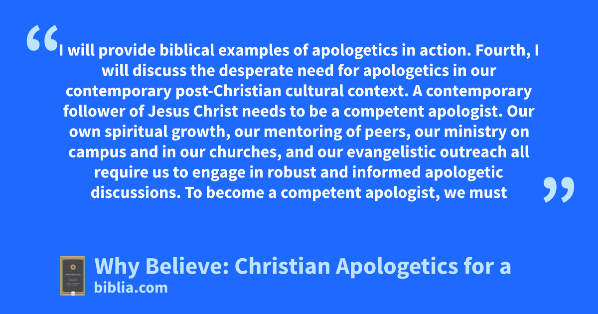 I will provide biblical examples of apologetics in action. Fourth, I will discuss the desperate need for apologetics in our contemporary post-Christian cultural context. A contemporary follower of Jesus Christ needs to be a competent apologist. Our own spiritual growth, our mentoring of peers, our ministry on campus and in our churches, and our evangelistic outreach all require us to engage in robust and informed apologetic discussions. To become a competent apologist, we must