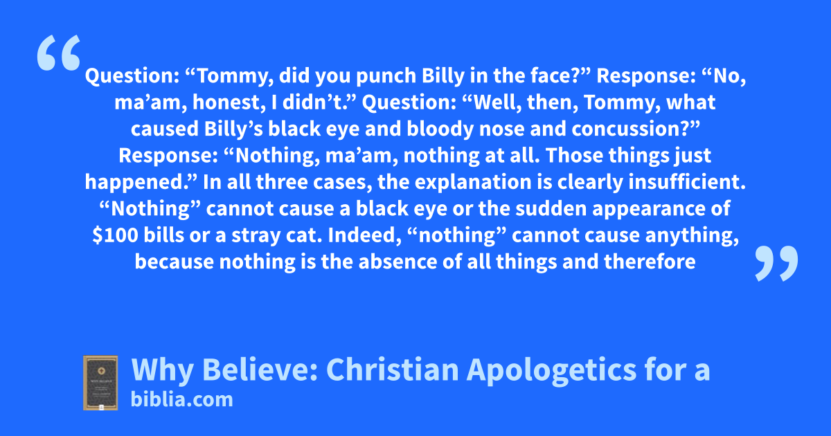 Question: “Tommy, did you punch Billy in the face?” Response: “No, ma’am, honest, I didn’t.” Question: “Well, then, Tommy, what caused Billy’s black eye and bloody nose and concussion?” Response: “Nothing, ma’am, nothing at all. Those things just happened.” In all three cases, the explanation is clearly insufficient. “Nothing” cannot cause a black eye or the sudden appearance of $100 bills or a stray cat. Indeed, “nothing” cannot cause anything, because nothing is the absence of all things and therefore