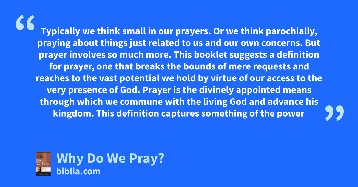Typically we think small in our prayers. Or we think parochially, praying about things just related to us and our own concerns. But prayer involves so much more. This booklet suggests a definition for prayer, one that breaks the bounds of mere requests and reaches to the vast potential we hold by virtue of our access to the very presence of God. Prayer is the divinely appointed means through which we commune with the living God and advance his kingdom. This definition captures something of the power
