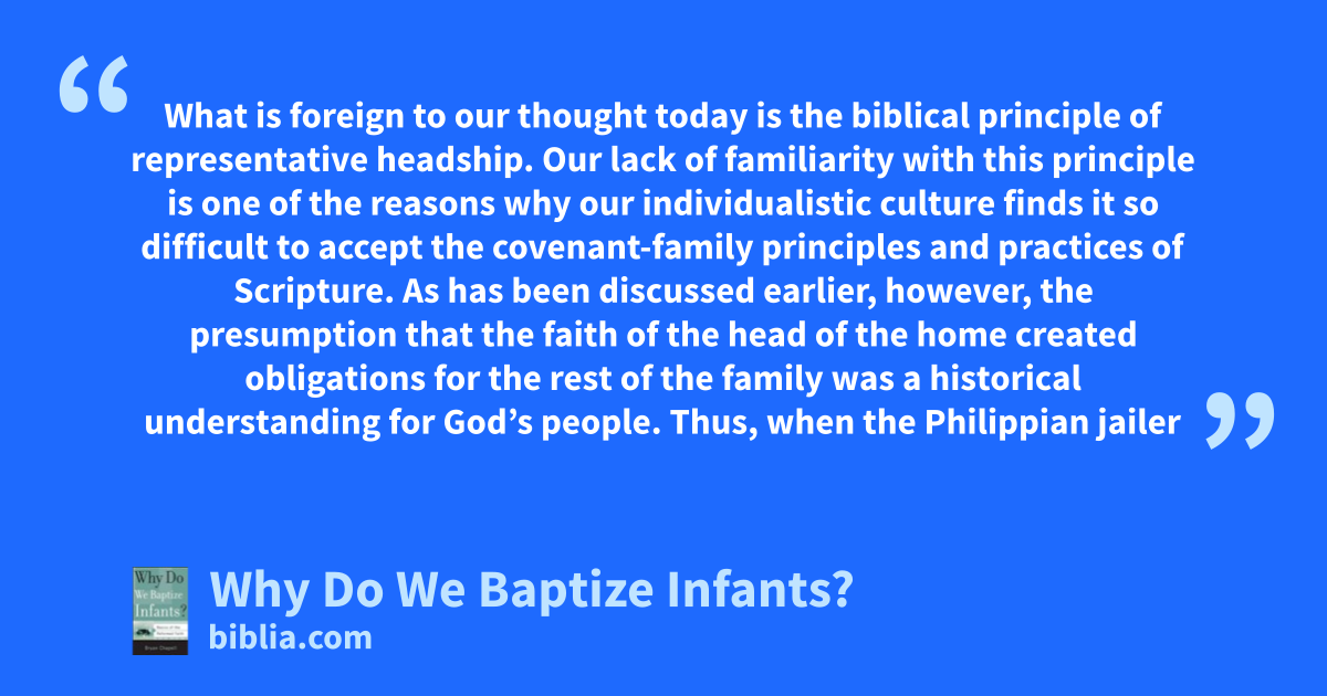 What is foreign to our thought today is the biblical principle of representative headship. Our lack of familiarity with this principle is one of the reasons why our individualistic culture finds it so difficult to accept the covenant-family principles and practices of Scripture. As has been discussed earlier, however, the presumption that the faith of the head of the home created obligations for the rest of the family was a historical understanding for God’s people. Thus, when the Philippian jailer