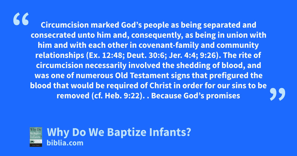Circumcision marked God’s people as being separated and consecrated unto him and, consequently, as being in union with him and with each other in covenant-family and community relationships (Ex. 12:48; Deut. 30:6; Jer. 4:4; 9:26). The rite of circumcision necessarily involved the shedding of blood, and was one of numerous Old Testament signs that prefigured the blood that would be required of Christ in order for our sins to be removed (cf. Heb. 9:22). . Because God’s promises