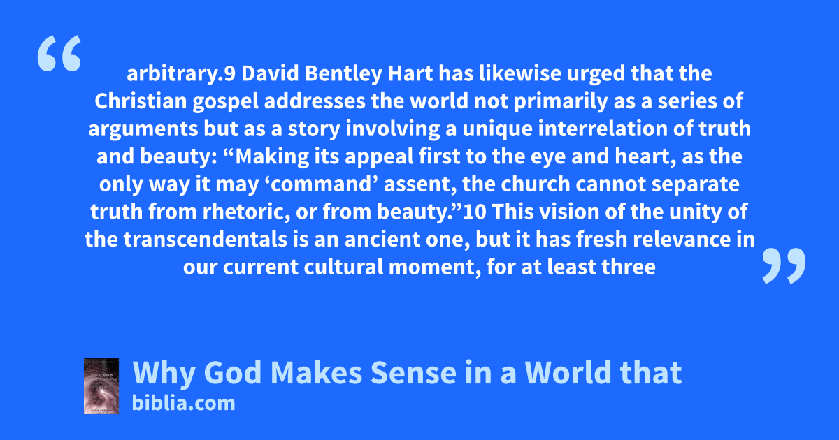 arbitrary.9 David Bentley Hart has likewise urged that the Christian gospel addresses the world not primarily as a series of arguments but as a story involving a unique interrelation of truth and beauty: “Making its appeal first to the eye and heart, as the only way it may ‘command’ assent, the church cannot separate truth from rhetoric, or from beauty.”10 This vision of the unity of the transcendentals is an ancient one, but it has fresh relevance in our current cultural moment, for at least three