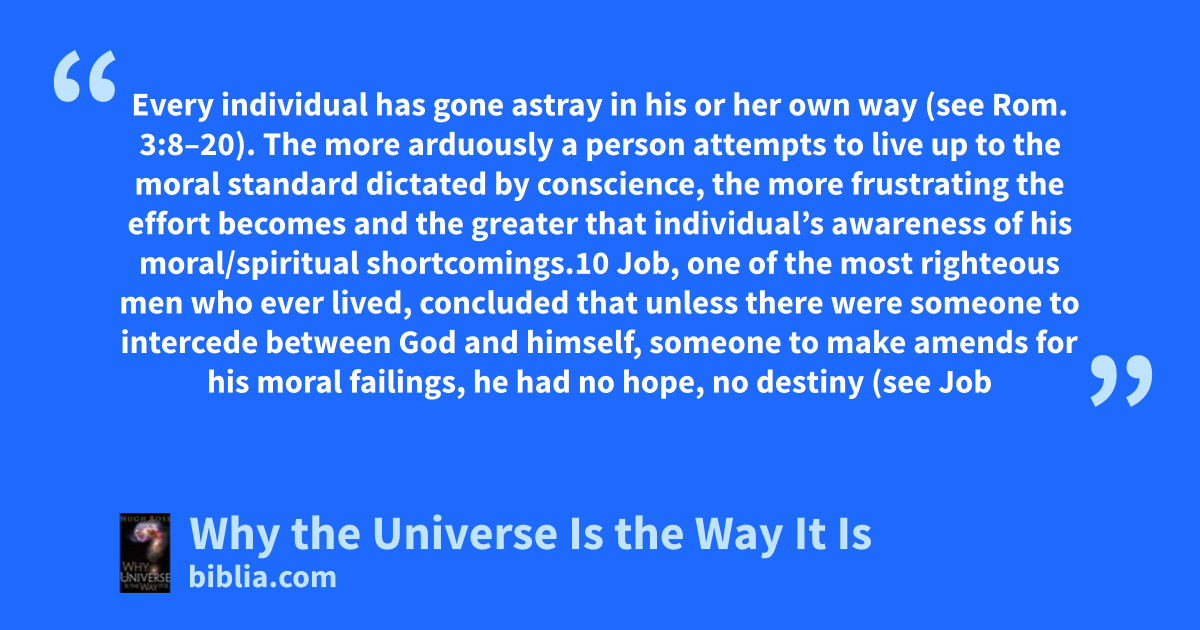 Every individual has gone astray in his or her own way (see Rom. 3:8–20). The more arduously a person attempts to live up to the moral standard dictated by conscience, the more frustrating the effort becomes and the greater that individual’s awareness of his moral/spiritual shortcomings.10 Job, one of the most righteous men who ever lived, concluded that unless there were someone to intercede between God and himself, someone to make amends for his moral failings, he had no hope, no destiny (see Job