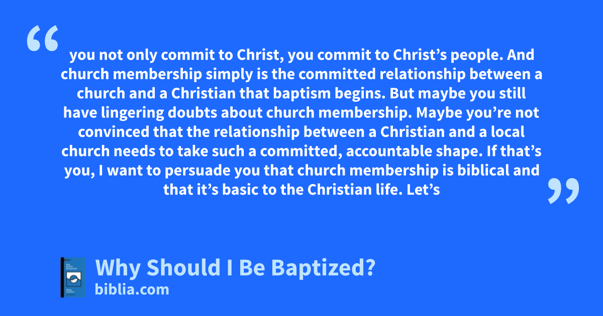 you not only commit to Christ, you commit to Christ’s people. And church membership simply is the committed relationship between a church and a Christian that baptism begins. But maybe you still have lingering doubts about church membership. Maybe you’re not convinced that the relationship between a Christian and a local church needs to take such a committed, accountable shape. If that’s you, I want to persuade you that church membership is biblical and that it’s basic to the Christian life. Let’s