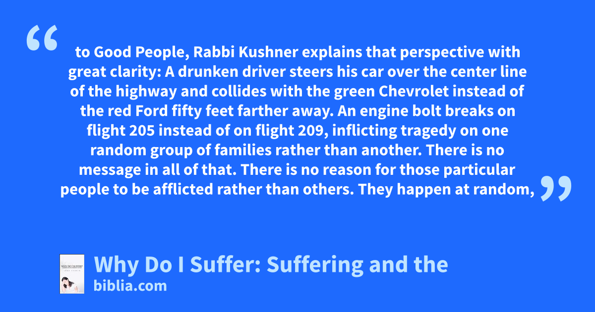to Good People, Rabbi Kushner explains that perspective with great clarity: A drunken driver steers his car over the center line of the highway and collides with the green Chevrolet instead of the red Ford fifty feet farther away. An engine bolt breaks on flight 205 instead of on flight 209, inflicting tragedy on one random group of families rather than another. There is no message in all of that. There is no reason for those particular people to be afflicted rather than others. They happen at random,