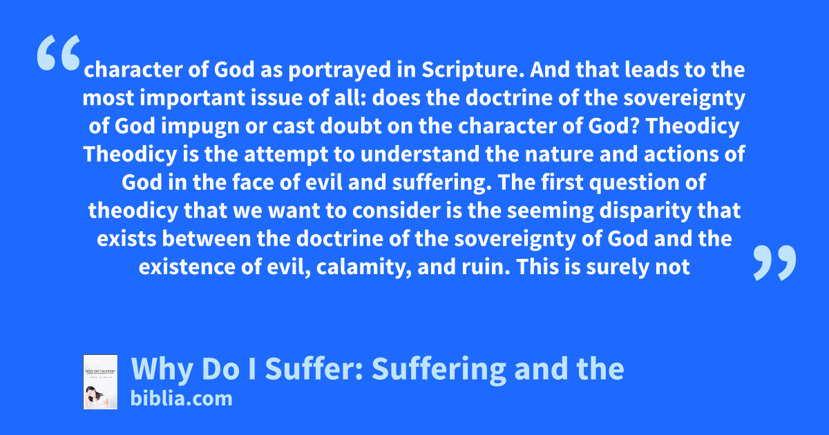 character of God as portrayed in Scripture. And that leads to the most important issue of all: does the doctrine of the sovereignty of God impugn or cast doubt on the character of God? Theodicy Theodicy is the attempt to understand the nature and actions of God in the face of evil and suffering. The first question of theodicy that we want to consider is the seeming disparity that exists between the doctrine of the sovereignty of God and the existence of evil, calamity, and ruin. This is surely not