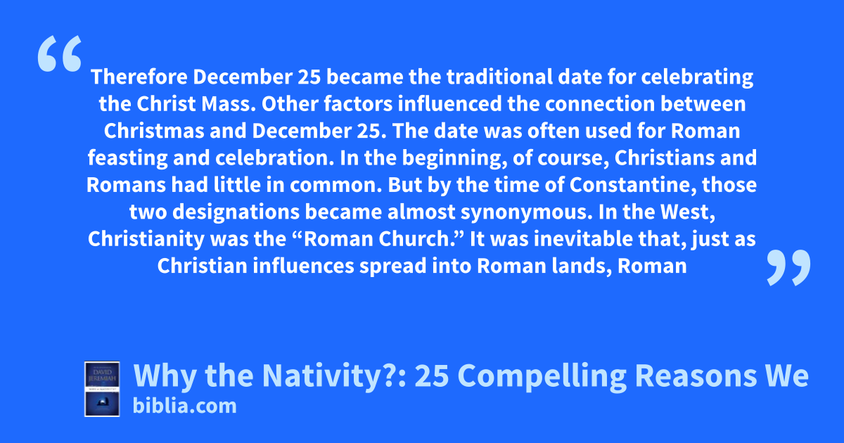 Therefore December 25 became the traditional date for celebrating the Christ Mass. Other factors influenced the connection between Christmas and December 25. The date was often used for Roman feasting and celebration. In the beginning, of course, Christians and Romans had little in common. But by the time of Constantine, those two designations became almost synonymous. In the West, Christianity was the “Roman Church.” It was inevitable that, just as Christian influences spread into Roman lands, Roman