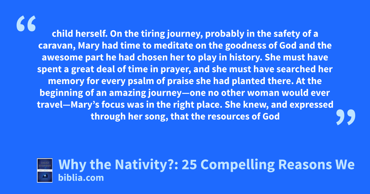 child herself. On the tiring journey, probably in the safety of a caravan, Mary had time to meditate on the goodness of God and the awesome part he had chosen her to play in history. She must have spent a great deal of time in prayer, and she must have searched her memory for every psalm of praise she had planted there. At the beginning of an amazing journey—one no other woman would ever travel—Mary’s focus was in the right place. She knew, and expressed through her song, that the resources of God