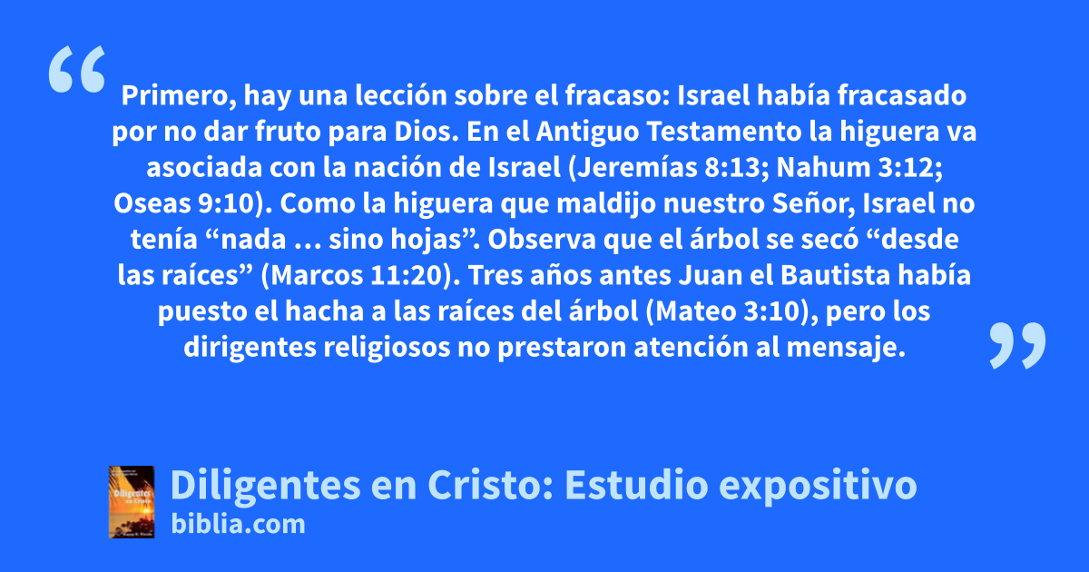 Primero, hay una lección sobre el fracaso: Israel había fracasado por no dar fruto para Dios. En el Antiguo Testamento la higuera va asociada con la nación de Israel (Jeremías 8:13; Nahum 3:12; Oseas 9:10). Como la higuera que maldijo nuestro Señor, Israel no tenía “nada … sino hojas”. Observa que el árbol se secó “desde las raíces” (Marcos 11:20). Tres años antes Juan el Bautista había puesto el hacha a las raíces del árbol (Mateo 3:10), pero los dirigentes religiosos no prestaron atención al mensaje.