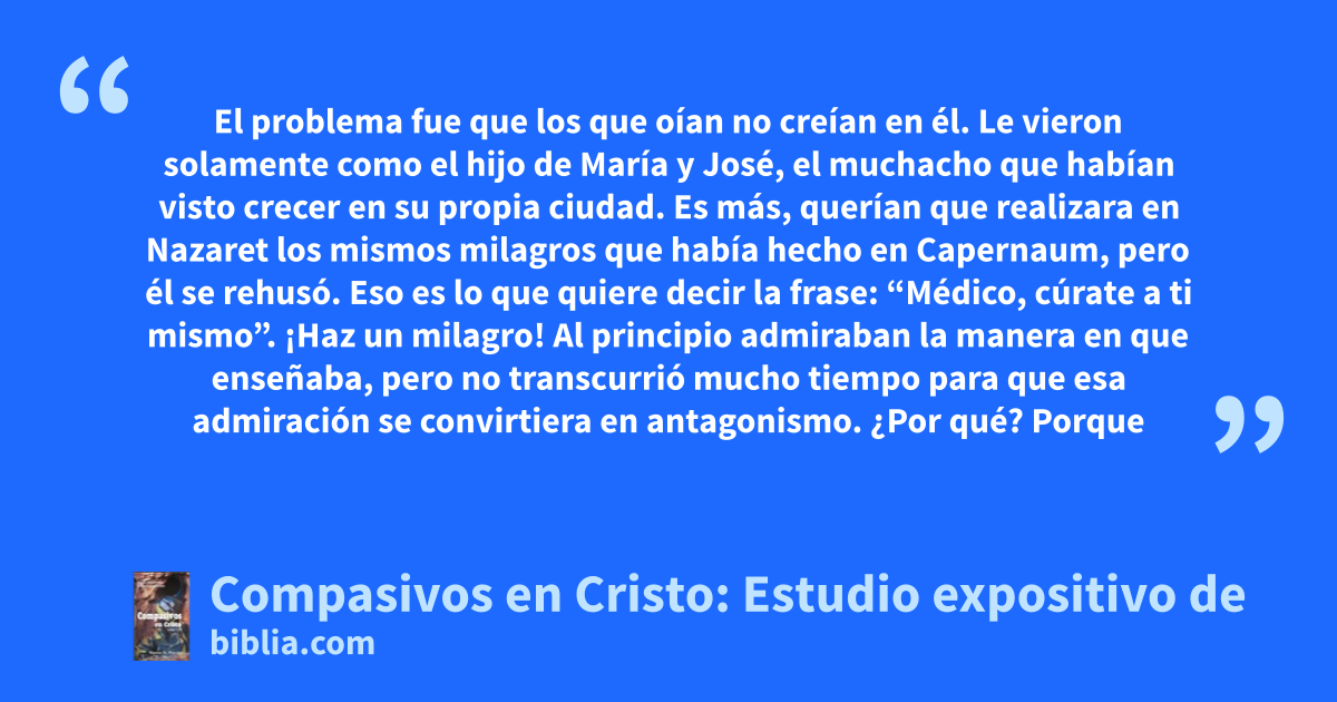 El problema fue que los que oían no creían en él. Le vieron solamente como el hijo de María y José, el muchacho que habían visto crecer en su propia ciudad. Es más, querían que realizara en Nazaret los mismos milagros que había hecho en Capernaum, pero él se rehusó. Eso es lo que quiere decir la frase: “Médico, cúrate a ti mismo”. ¡Haz un milagro! Al principio admiraban la manera en que enseñaba, pero no transcurrió mucho tiempo para que esa admiración se convirtiera en antagonismo. ¿Por qué? Porque