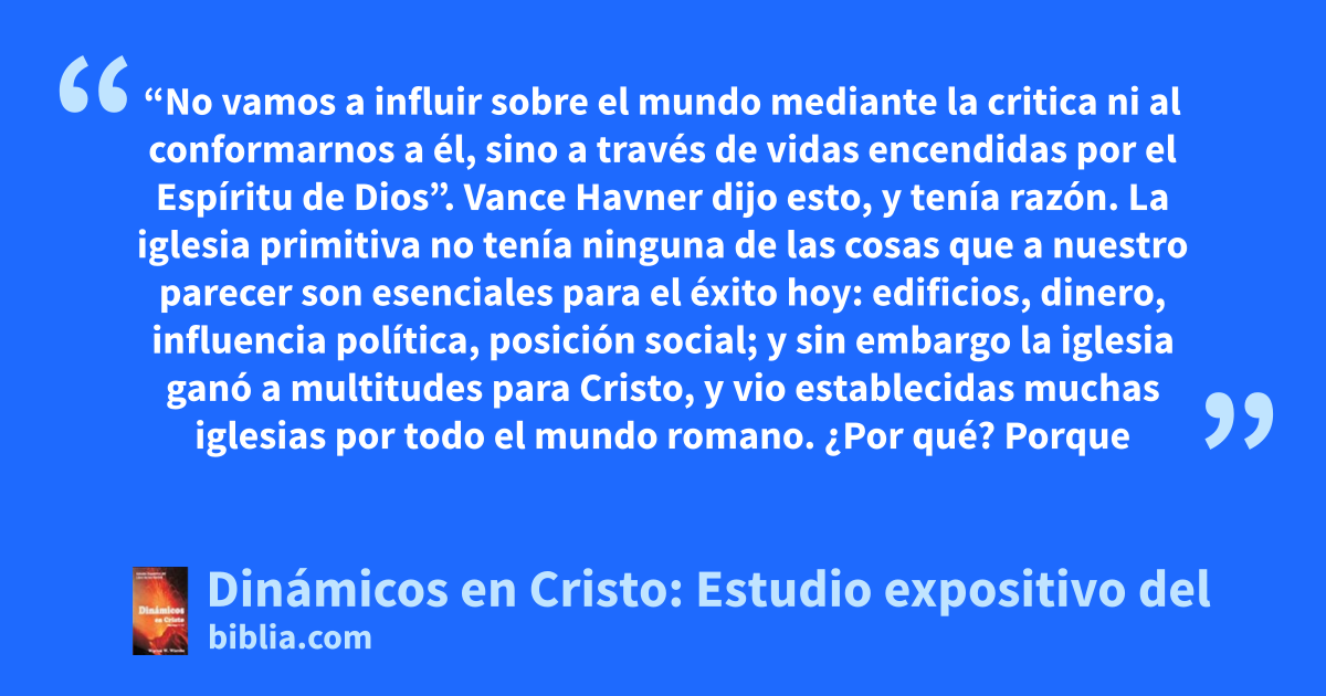 “No vamos a influir sobre el mundo mediante la critica ni al conformarnos a él, sino a través de vidas encendidas por el Espíritu de Dios”. Vance Havner dijo esto, y tenía razón. La iglesia primitiva no tenía ninguna de las cosas que a nuestro parecer son esenciales para el éxito hoy: edificios, dinero, influencia política, posición social; y sin embargo la iglesia ganó a multitudes para Cristo, y vio establecidas muchas iglesias por todo el mundo romano. ¿Por qué? Porque