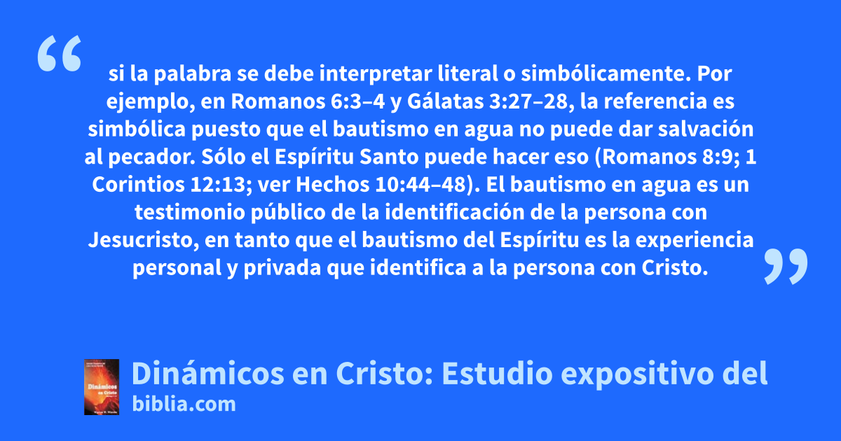 si la palabra se debe interpretar literal o simbólicamente. Por ejemplo, en Romanos 6:3–4 y Gálatas 3:27–28, la referencia es simbólica puesto que el bautismo en agua no puede dar salvación al pecador. Sólo el Espíritu Santo puede hacer eso (Romanos 8:9; 1 Corintios 12:13; ver Hechos 10:44–48). El bautismo en agua es un testimonio público de la identificación de la persona con Jesucristo, en tanto que el bautismo del Espíritu es la experiencia personal y privada que identifica a la persona con Cristo.