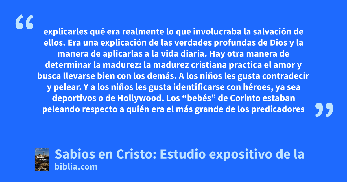 explicarles qué era realmente lo que involucraba la salvación de ellos. Era una explicación de las verdades profundas de Dios y la manera de aplicarlas a la vida diaria. Hay otra manera de determinar la madurez: la madurez cristiana practica el amor y busca llevarse bien con los demás. A los niños les gusta contradecir y pelear. Y a los niños les gusta identificarse con héroes, ya sea deportivos o de Hollywood. Los “bebés” de Corinto estaban peleando respecto a quién era el más grande de los predicadores