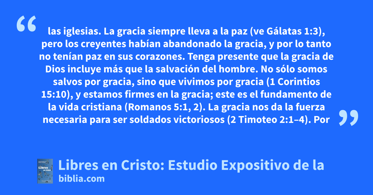 las iglesias. La gracia siempre lleva a la paz (ve Gálatas 1:3), pero los creyentes habían abandonado la gracia, y por lo tanto no tenían paz en sus corazones. Tenga presente que la gracia de Dios incluye más que la salvación del hombre. No sólo somos salvos por gracia, sino que vivimos por gracia (1 Corintios 15:10), y estamos firmes en la gracia; este es el fundamento de la vida cristiana (Romanos 5:1, 2). La gracia nos da la fuerza necesaria para ser soldados victoriosos (2 Timoteo 2:1–4). Por