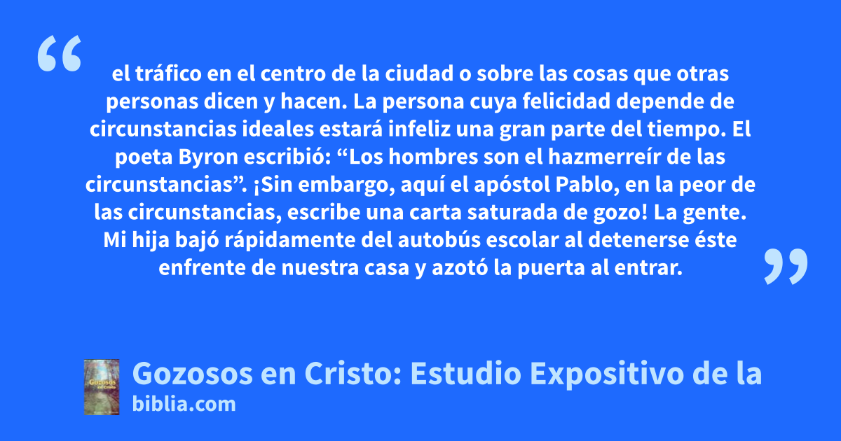 el tráfico en el centro de la ciudad o sobre las cosas que otras personas dicen y hacen. La persona cuya felicidad depende de circunstancias ideales estará infeliz una gran parte del tiempo. El poeta Byron escribió: “Los hombres son el hazmerreír de las circunstancias”. ¡Sin embargo, aquí el apóstol Pablo, en la peor de las circunstancias, escribe una carta saturada de gozo! La gente. Mi hija bajó rápidamente del autobús escolar al detenerse éste enfrente de nuestra casa y azotó la puerta al entrar.