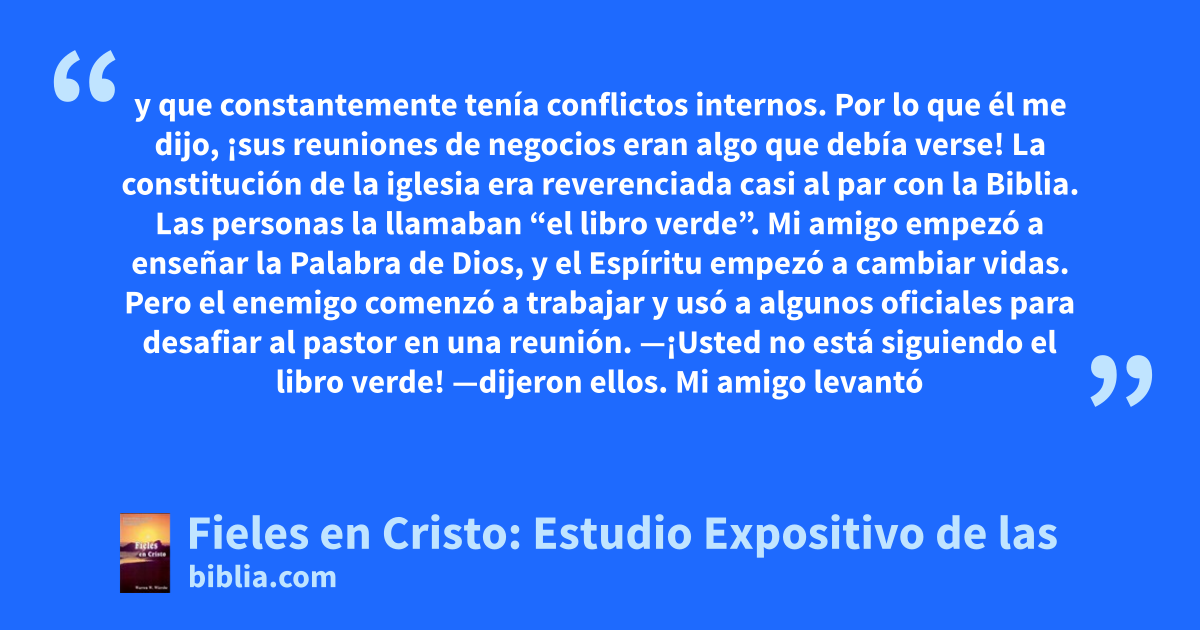 y que constantemente tenía conflictos internos. Por lo que él me dijo, ¡sus reuniones de negocios eran algo que debía verse! La constitución de la iglesia era reverenciada casi al par con la Biblia. Las personas la llamaban “el libro verde”. Mi amigo empezó a enseñar la Palabra de Dios, y el Espíritu empezó a cambiar vidas. Pero el enemigo comenzó a trabajar y usó a algunos oficiales para desafiar al pastor en una reunión. —¡Usted no está siguiendo el libro verde! —dijeron ellos. Mi amigo levantó