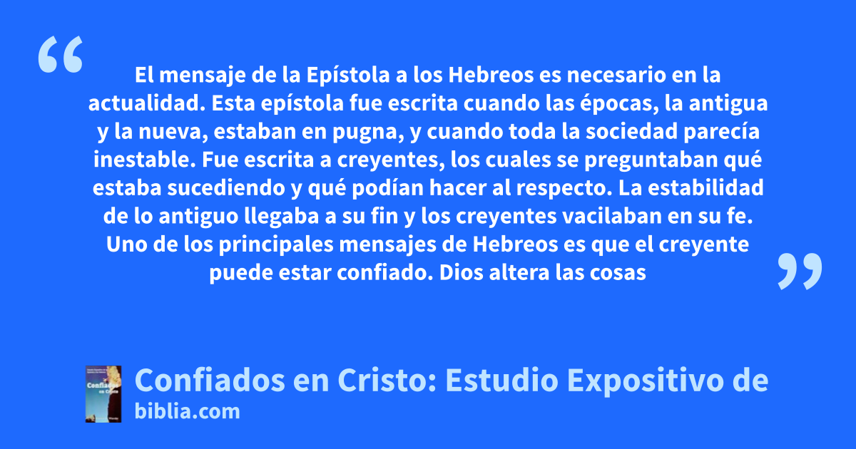 El mensaje de la Epístola a los Hebreos es necesario en la actualidad. Esta epístola fue escrita cuando las épocas, la antigua y la nueva, estaban en pugna, y cuando toda la sociedad parecía inestable. Fue escrita a creyentes, los cuales se preguntaban qué estaba sucediendo y qué podían hacer al respecto. La estabilidad de lo antiguo llegaba a su fin y los creyentes vacilaban en su fe. Uno de los principales mensajes de Hebreos es que el creyente puede estar confiado. Dios altera las cosas