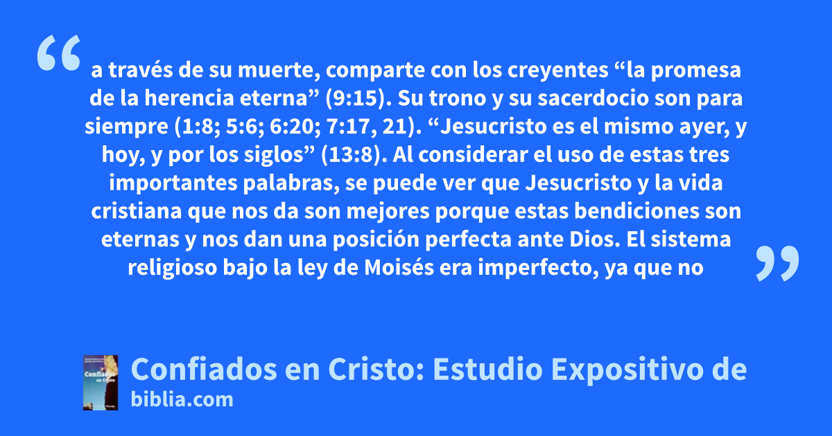 a través de su muerte, comparte con los creyentes “la promesa de la herencia eterna” (9:15). Su trono y su sacerdocio son para siempre (1:8; 5:6; 6:20; 7:17, 21). “Jesucristo es el mismo ayer, y hoy, y por los siglos” (13:8). Al considerar el uso de estas tres importantes palabras, se puede ver que Jesucristo y la vida cristiana que nos da son mejores porque estas bendiciones son eternas y nos dan una posición perfecta ante Dios. El sistema religioso bajo la ley de Moisés era imperfecto, ya que no