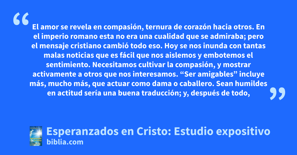El amor se revela en compasión, ternura de corazón hacia otros. En el imperio romano esta no era una cualidad que se admiraba; pero el mensaje cristiano cambió todo eso. Hoy se nos inunda con tantas malas noticias que es fácil que nos aislemos y embotemos el sentimiento. Necesitamos cultivar la compasión, y mostrar activamente a otros que nos interesamos. “Ser amigables” incluye más, mucho más, que actuar como dama o caballero. Sean humildes en actitud sería una buena traducción; y, después de todo,